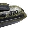 Лодка сделана из камуфлированной ткани и не маркая. Её могут использовать как рыбаки так и охотники, логотип, бортовой привал и вся фурнитура на лодке сделаны из чёрного цвета.